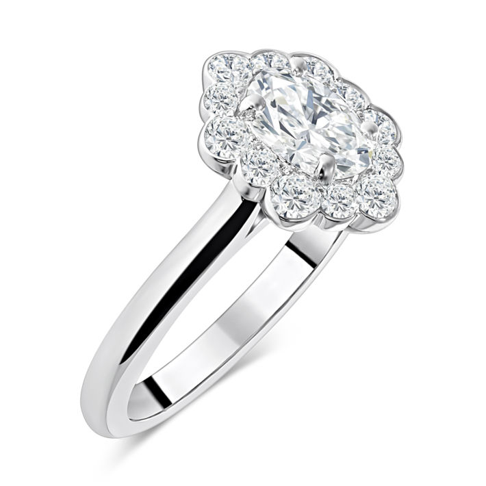 Oval cut diamond cluster ring with scalloped edge