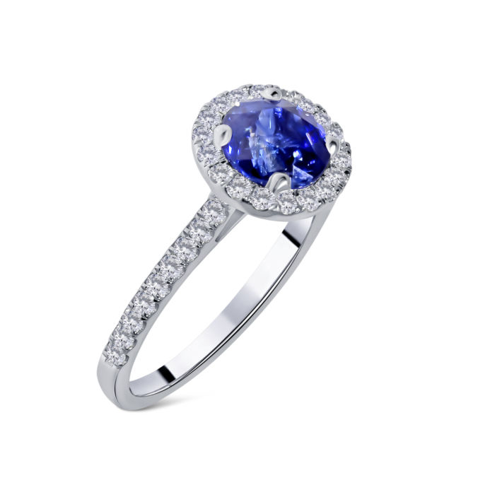 Round cut sapphire and diamond cluster ring with diamond shoulders