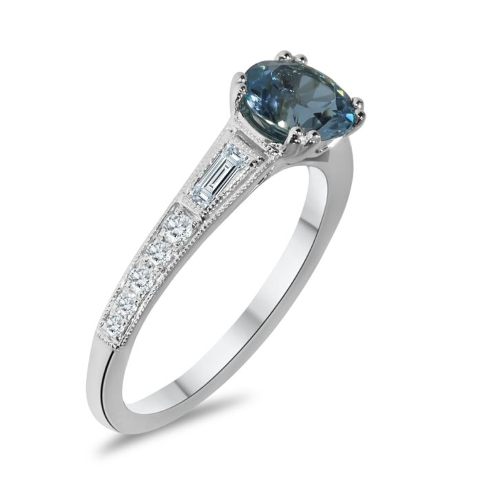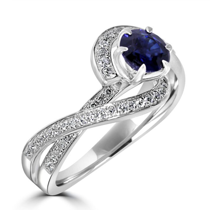 Single stone round sapphire ring with diamond “swirl” shoulders