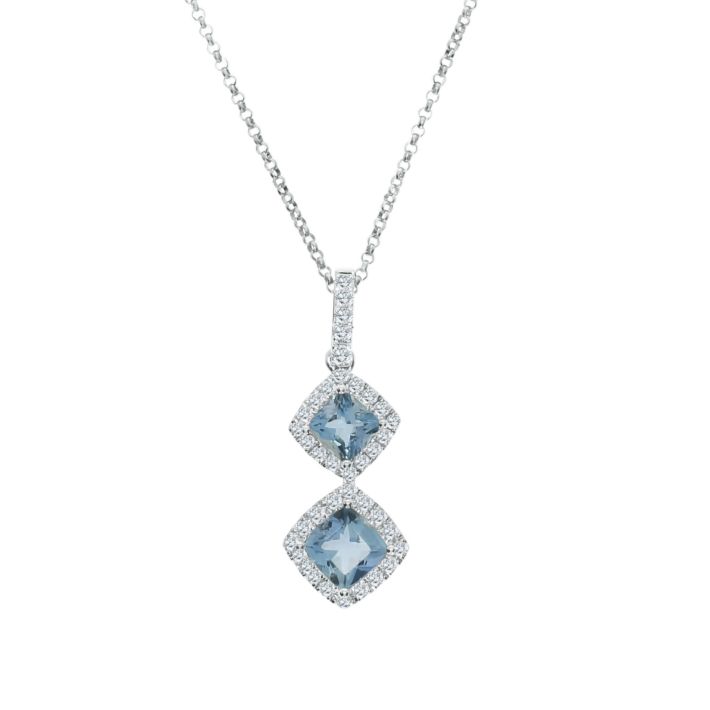 18ct white gold pendant with 2 cushion cut aquamarines, 1.48ct total, each surrounded with brilliant cut diamonds and suspended from a diamond set bale, all claw set. Total diamond weight 0.41ct. On 18″ fine trace chain.