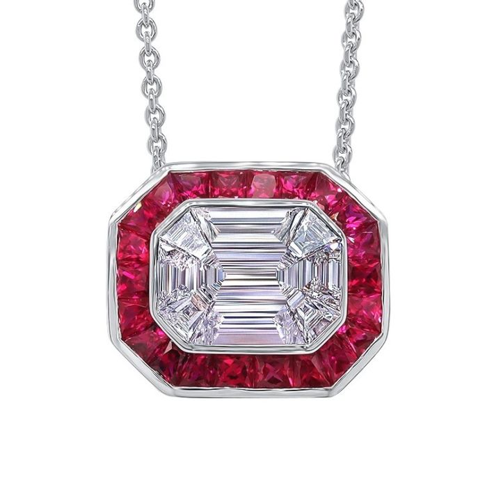18ct white gold rectangular landscape ruby and diamond “deco style” pendant with 9 mixed “step cut” diamonds to the centre totalling 0.54ct surrounded by 22 rubies cut to fit 0.72ct . All in rubbed over setting. Including chain
