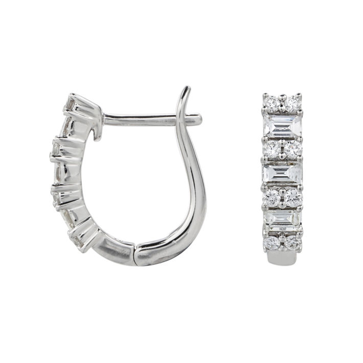 18ct white gold all diamond huggy type hoops each with 3 baguettes set alternately with 4 pairs of brilliant cuts all claw set. 0.58ct total