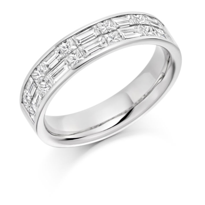 Platinum half eternity ring, channel set with double row of alternating baguette cut (10 total) and princess cut diamonds (12 total), total diamond weight 1.25ct.