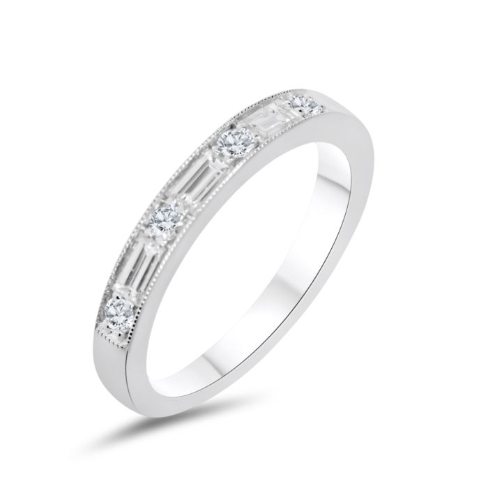 Platinum all diamond millegrain edge band set with 5 baguette cuts 0.39ct and 6 brilliant cuts 0.18ct. Total diamond weight 0.57ct