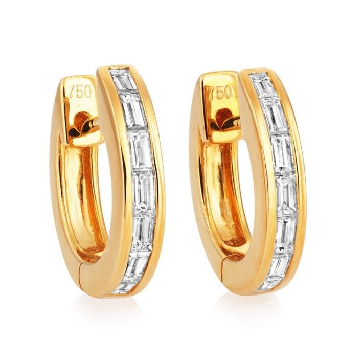 18ct yellow gold 7st baguette cut diamond channel set hoop earrings totalling 0.59ct