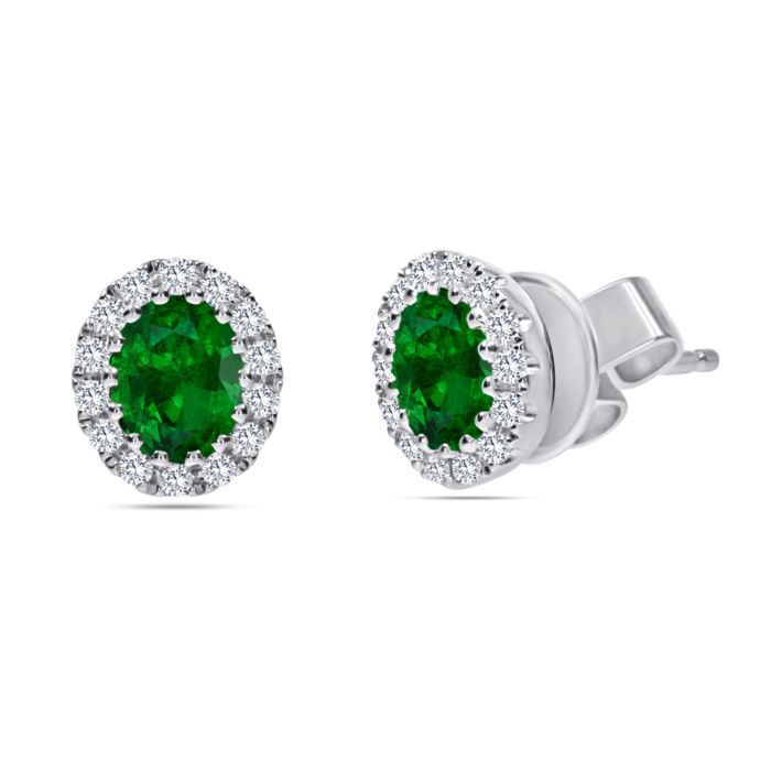 18ct white gold 14×1 oval cluster earrings with centre emerald 0.55ct surrounded by 14 diamonds 0.18ct total, claw set