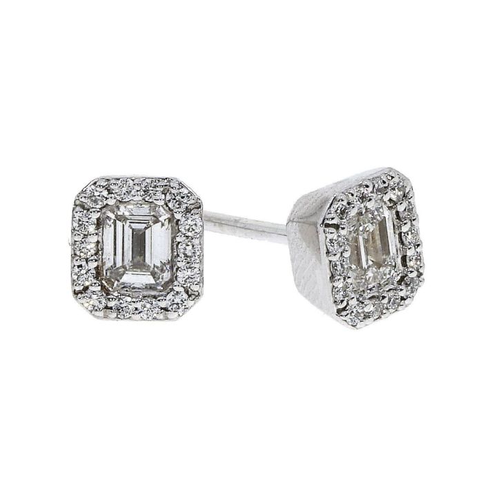 18ct white gold 14 x 1 all diamond cluster stud earrings with central emerald cuts 0.43ct total, and brilliant cuts 0.12ct total.