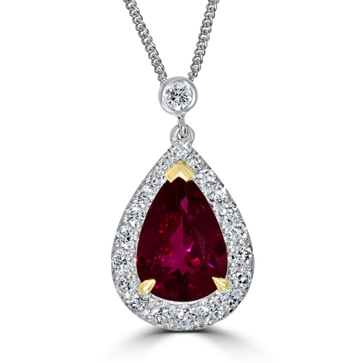 18ct white gold cluster pendant with pear shaped pink tourmaline 3.15ct surrounded by 20 claw set brilliant cut diamonds, suspended from 1 more in rubbed over setting 0.66ct total, on chain.