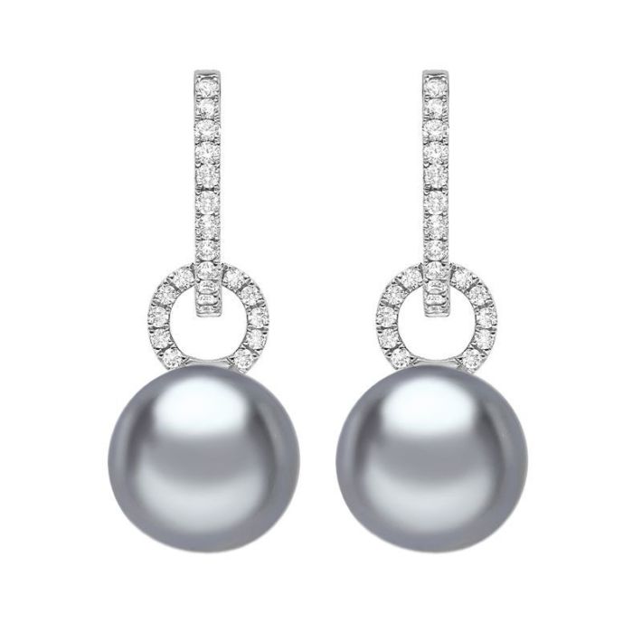 18ct white gold brilliant cut diamond hoop earrings with 9-9.5mm light grey tahitian pearl drop with diamond set circle top, total weight 0.30ct.