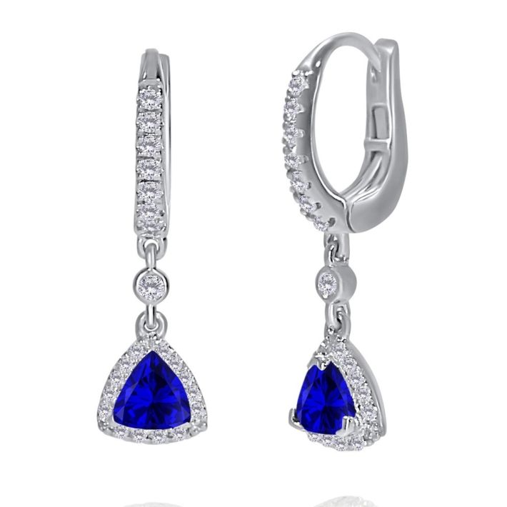 Trilliant cut sapphire and round brilliant cut diamond cluster drop earrings
